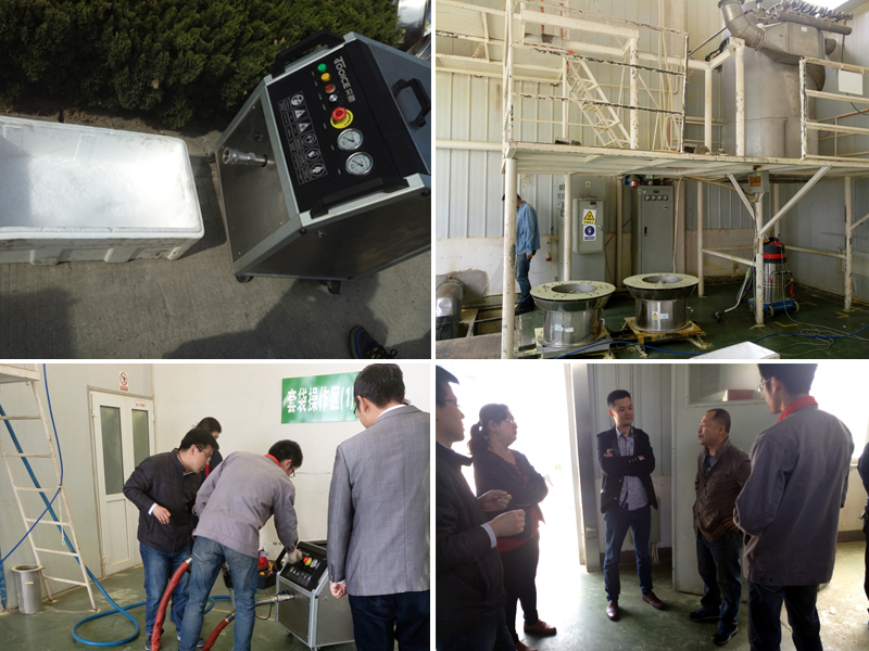 煙臺(tái)突馳機(jī)電科技應(yīng)某產(chǎn)業(yè)園工廠要求現(xiàn)場(chǎng)試驗(yàn)——用干冰清洗機(jī)對(duì)生產(chǎn)設(shè)備內(nèi)壁進(jìn)行清洗效果演示。
